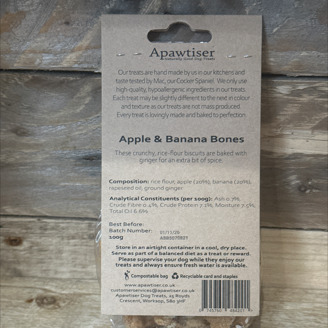 Baked with rice flour and packed with red apple, banana, and a hint of ginger, these bone-shaped biscuits are bursting with tasty goodness. Apples bring a boost of vitamins A and C, while bananas serve up potassium, magnesium, and fibre for happy tummies. They’re easy to snap into smaller bites and completely free from common allergens like dairy, wheat, pork, and beef — making them the perfect feel-good treat for every kind of dog!