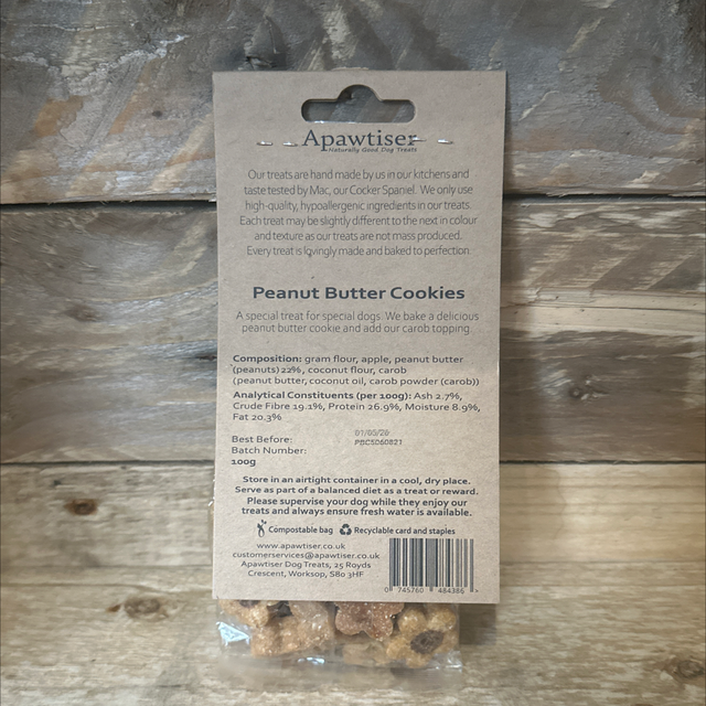 Gram flour, apple, peanut butter ((Peanuts)22%), coconut flour carob drop (peanut butter, coconut oil, carob powder (carob))