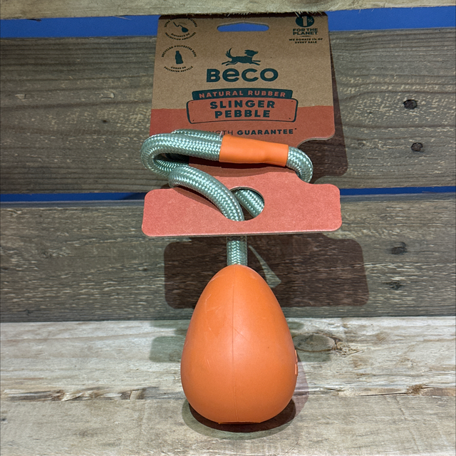 Fetch just got a whole lot more fun! The Beco Slinger Pebble Toy is made from soft, springy natural rubber that’s gentle on teeth and tough enough for endless games. The strong recycled rope handle gives you super throwing power (hello, long-distance fetch!), while the bright colours make it easy to spot in tall grass. With a gentle vanilla scent and a satisfyingly bouncy feel, this eco-friendly toy is a fetch favourite in the making!