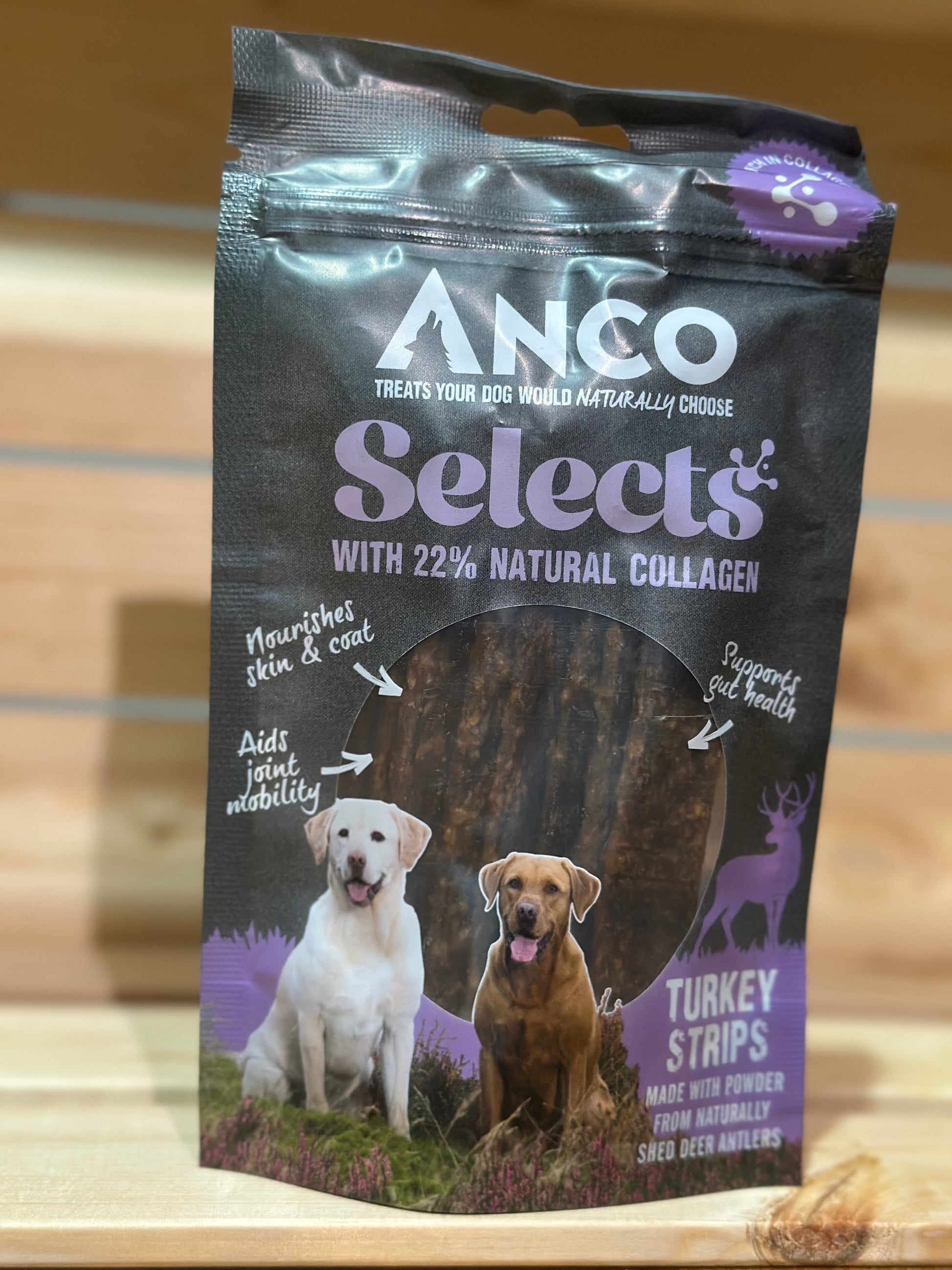 Give your dog a tasty boost with Anco Selects Turkey Strips with Collagen! These scrumptious treats blend the natural collagen from shed deer antlers with lean, high-quality turkey to keep your pup feeling their best. Turkey is gentle on tummies and packed with essential amino acids to help your dog stay strong and sprightly. It’s also full of naturally occurring B vitamins, selenium and zinc—tiny nutritional powerhouses that help support immune health, cellular function and steady energy.